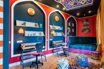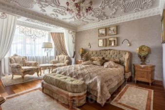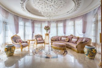 - Главный дом (6 спален): Просторные люксы с панорамными окнами, каминные зоны, гардеробные премиум-класса. Парадная лестница, отделанная венецианской штукатуркой, ведет в винный погреб и домашний кинотеатр.