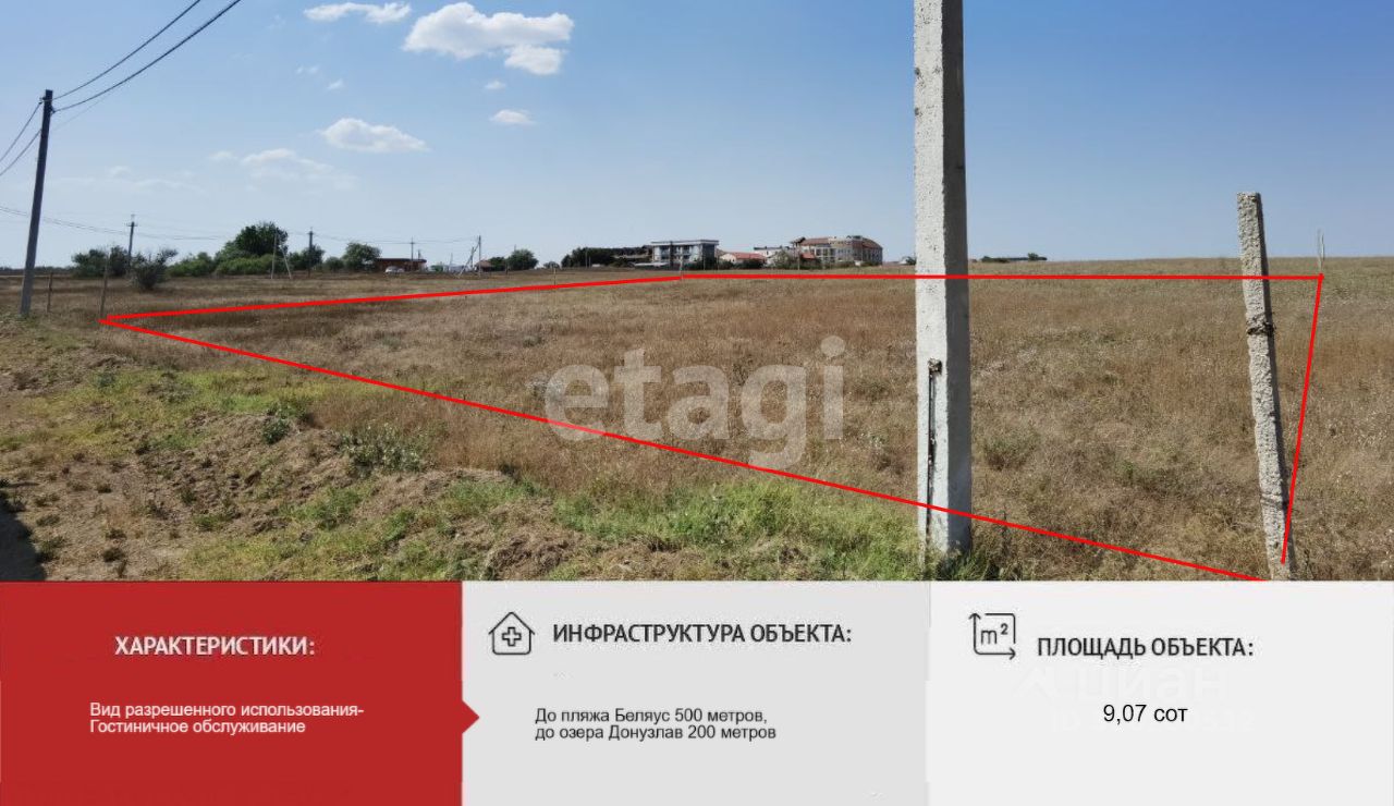 Участок ровный, правильной прямоугольной формы. Линия электропередач находится по границе участка, что обеспечивает удобное подключение к коммуникациям. До моря — всего 500 метров, при этом участок предлагает панорамный вид на побережье косы Беляус и озеро Донузлав, расположенное в 300 метрах.