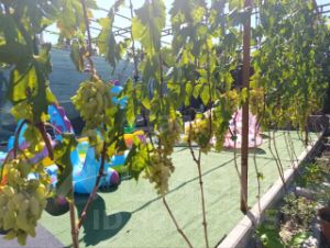 Великолепно озелененный двор с розами, туями, виноградом и гранатом, вымощенный тротуарной плиткой.