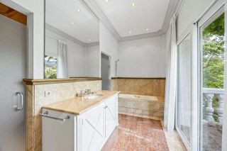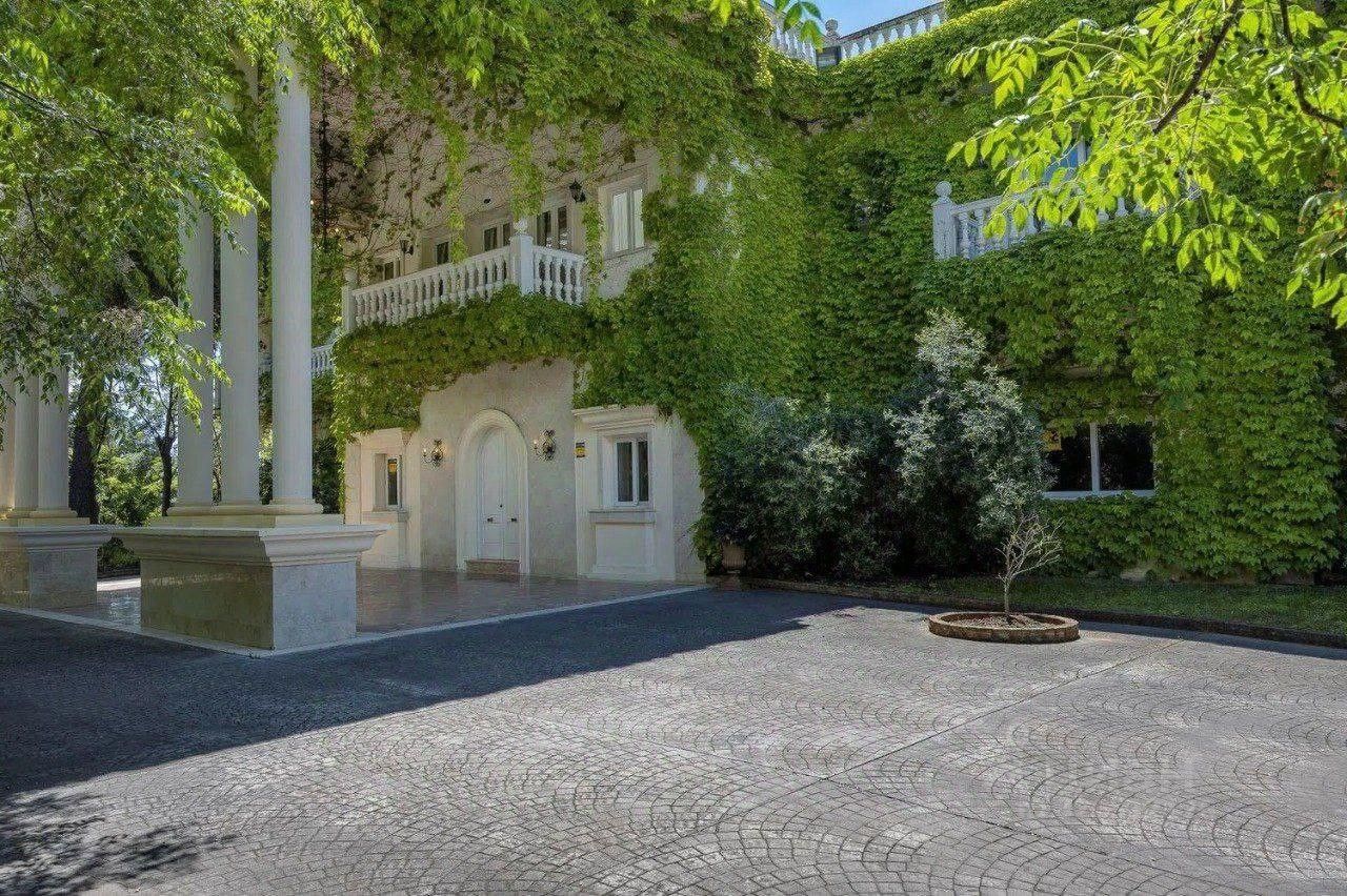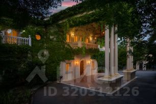 Дом выполнен в европейском неоклассическом стиле: фасад с колоннами, резные балконы, натуральный камень, террасы, утопающие в зелени.