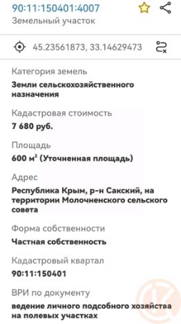 При звонке сообщите нам, пожалуйста, номер 545513 Предлагается участок 6 соток с видом на море в с. Витино, от Евпатории 15мин езды. Рядом проходят столбы электричества, возможно подключение. Также есть возможность расшириться за счет смежных участков. Данный участок по новому ген.плану войдет в границы населенного пункта с возможностью перевода в ИЖС. Вокруг все активно застраивается гостевыми домами, шикарное место для отдыха с видом на море! Отличный вариант для инвестиций.