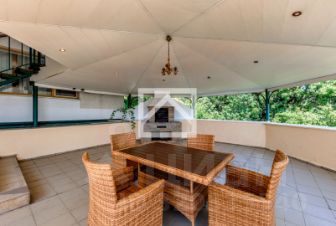Дополнительная закрытая терраса обеспечивает уютное пространство для отдыха вне зависимости от погоды. Территория дома окружена зеленью и ухоженным ландшафтом, где расположена беседка с зоной для барбекю — идеальное место для встреч с друзьями и семьёй.