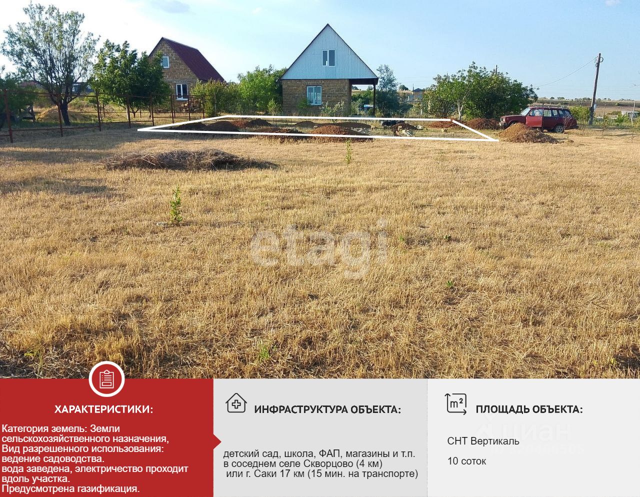 Продается земельный участок площадью 10 соток в СНТ "Вертикаль" — перспективный вариант для строительства загородного дома или дачи. Участок ровный, с плодородным черноземом, уже высажен фруктовый сад.что делает его пригодным как для жилой застройки, так и для ведения хозяйства. Уже подготовлен фундамент, что ускоряет начало строительства. Коммуникации частично подведены: есть артезианская вода, заведена на участок, а колодец с подводом воды обложен ракушняком. Электричество проходит вдоль участка, по генплану предусмотрена газификация. С одной стороны территория огорожена соседским забором. Рядом расположен сосновый бор, обеспечивающий чистый воздух и приятный микроклимат.