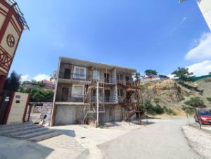 На первом этаже просторный гараж, второй и третий этажи - полноценные квартиры-студии по 34 кв.м. На втором и третьем этажах имеются балконы, заведены коммуникации (вода, канализация, электричество). Мощность электричества в доме - 15 кВт. С задней стороны дома, благодаря рельефу местности, со второго этажа можно сделать отдельный выход.