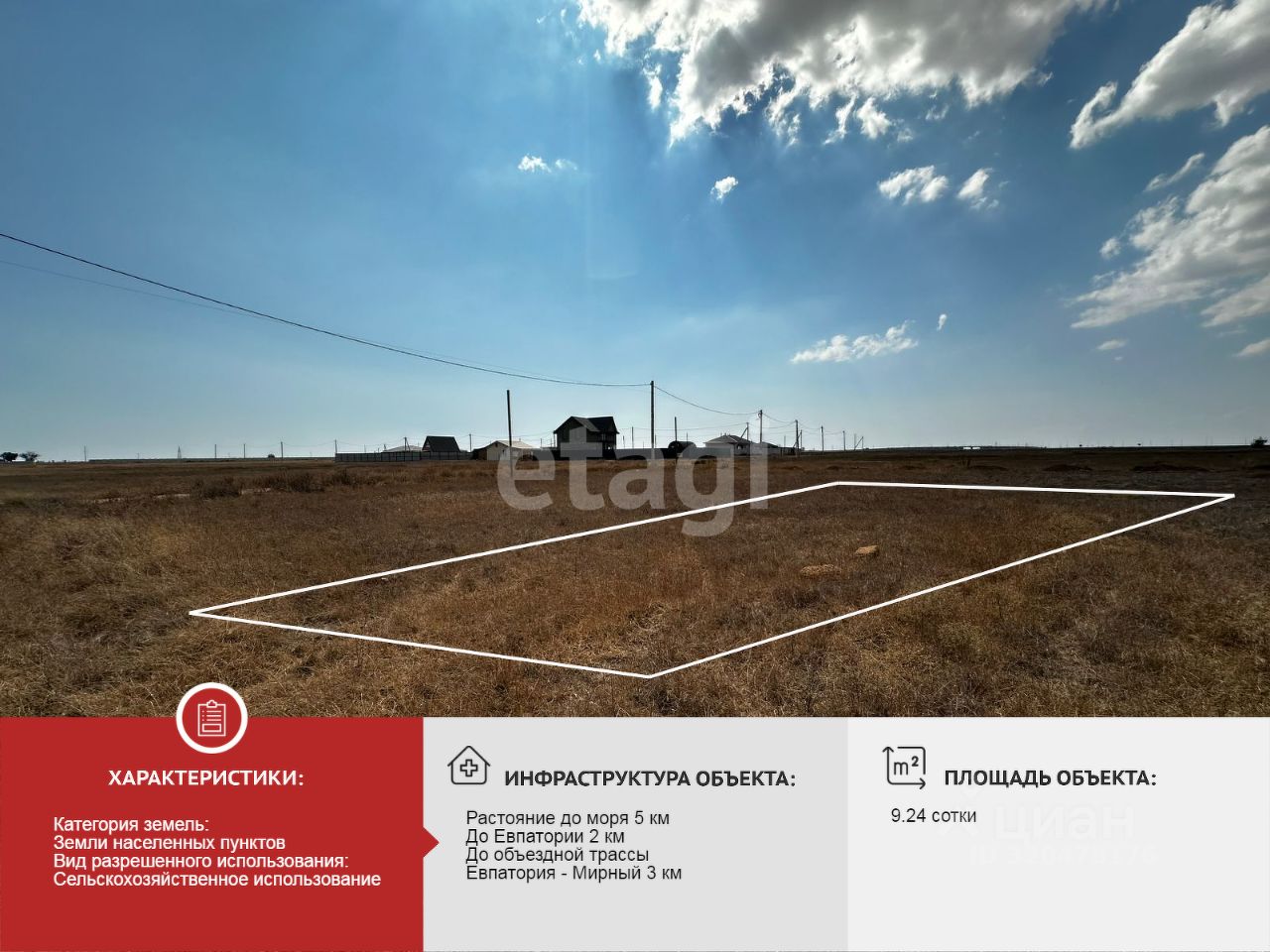 Электричество и вода по границе земельного участка. В одном километре от участка расположен газораспределительный пункт. Участок расположен в очень хорошем месте, в непосредственной близости от города Евпатория и в пяти километрах от песчаного пляжа. Данная локация активно застраивается.