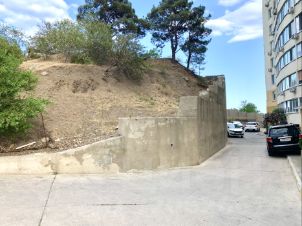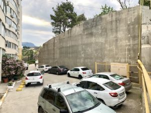 По границе участка со стороны автомобильной дороги выполнена подпорная стена.