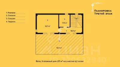 3 этаж : комната свободного назначения и терраса 50 м² с панорамными видами.