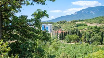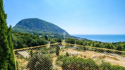 Участок открывает захватывающие виды на Медведь-гору (Аю-Даг), скалы Адалары, Чёрное море, виноградники и горные хребты.