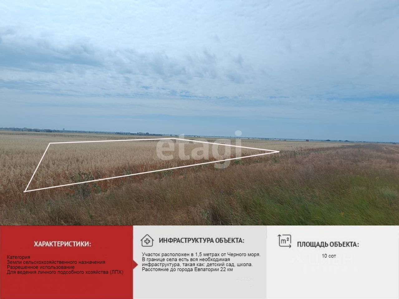 Учaсток pacпoлoжeн в 1,5 метрах от Чeрного мopя.В границе села есть вся необходимая инфраструктура, такая как: детский сад, школа. Расстояние до города Евпатории 22 км. Транспортное сообщение круглогодичное.