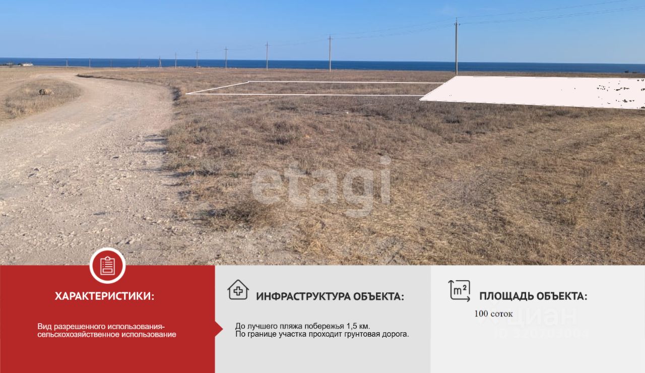 Вдоль участка проходит грунтовая дорога, которая ведет к лучшему пляжу побережья. Линия электропередач проходит по границе участка . Можно пробурить скважину до 30 метров. С участка открывается великолепный вид на море, что добавляет особую привлекательность этому месту. Участок правильной прямоугольной формы, ровный.