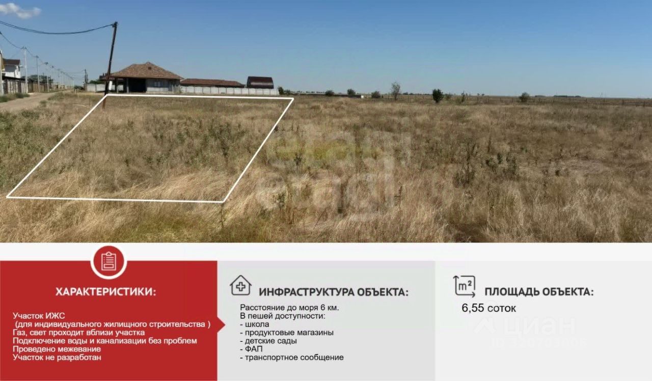 Электричество и вода по границе земельного участка. В одном километре от участка расположен газораспределительный пункт. Участок расположен в очень хорошем месте, в непосредственной близости от города Евпатория и в пяти километрах от песчаного пляжа. Данная локация активно застраивается.