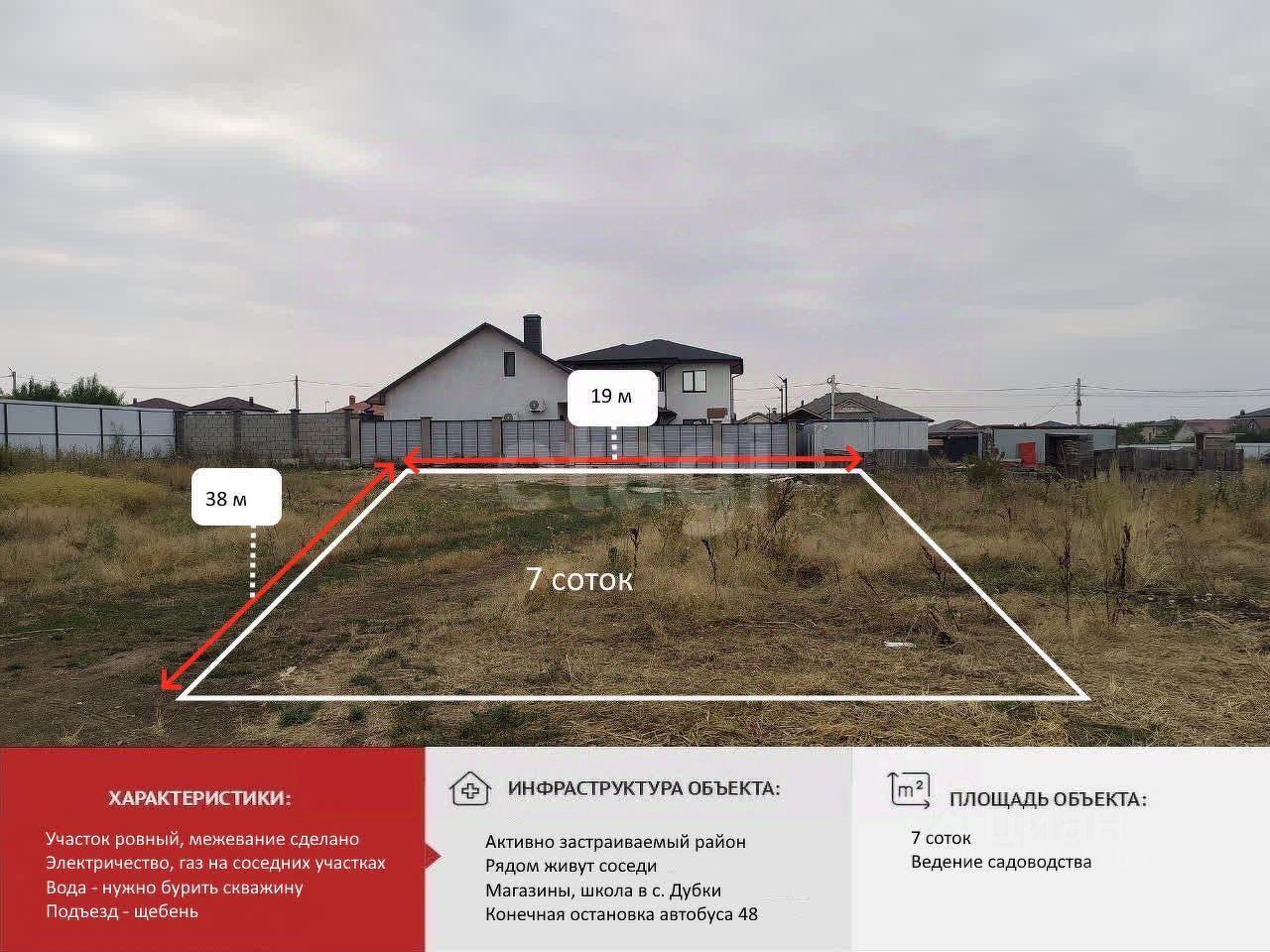 Район активно застраивается, что свидетельствует о его привлекательности для жизни и инвестиций. В шаговой доступности находится село Дубки с развитой инфраструктурой: магазины, школа, остановка общественного транспорта. Это позволяет решать повседневные задачи без необходимости длительных поездок. Участок подходит для строительства частного дома или дачи с учетом действующих норм и правил застройки. Отсутствие промышленных объектов поблизости и близость к природе делают это место комфортным для постоянного проживания или сезонного отдыха.