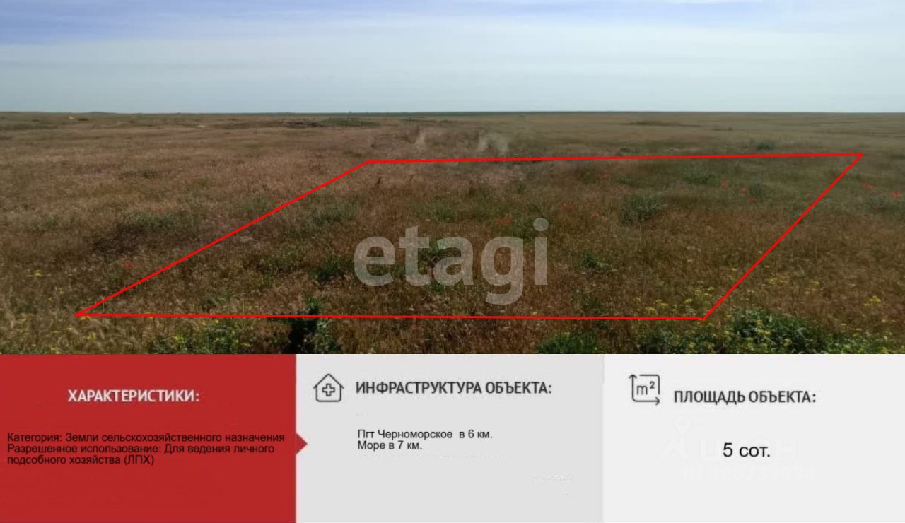 Земельный участок площадью 5 соток расположен в 6 км от курортного поселка Черноморское, в живописной местности с удобной транспортной доступностью.