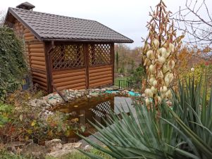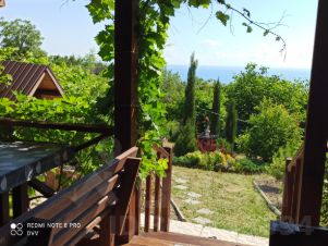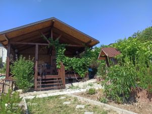 18ти метровая полностью деревянная беседка на бетонных сваях с мангалом и плитой. Колонны - 100мм брусс. Плита предусматривает установку казана для плова, мангал - на 8 шампуров в одном заходе. Все неоднократно испытано. Из беседки прекрасный вид на море.