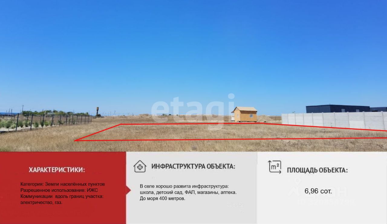 Участок ровный, прямоугольной формы, без построек. Находится на ровной возвышенности, с участка открывается вид на море и Караджинскую бухту. Все коммуникации идут вдоль границ участка- электричество, газ. В селе есть центральное водоснабжение. Район активно застраивается.
