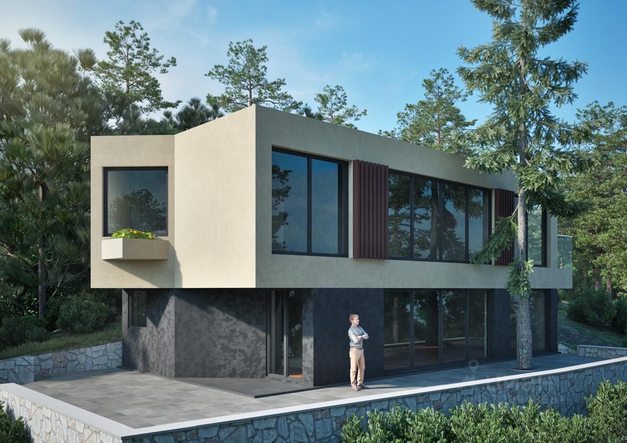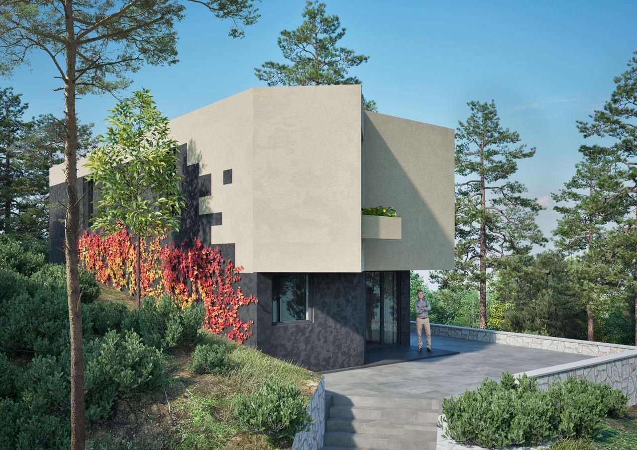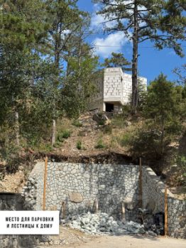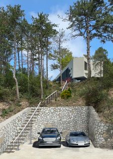 Участок, на котором расположен дом, напоминает крымский лес, что обусловлено наличием краснокнижных растений, таких как можжевельники, земляничник мелкоплодный, крымские сосны, ели и дубы. Архитектура дома спроектирована с учетом минимизации воздействия на окружающую природу и создания ощущения уединения. Подъезд для автомобиля отсутствует, однако предусмотрено парковочное место ниже уровня дома. Территория и дом характеризуются высоким уровнем уюта и тишины.