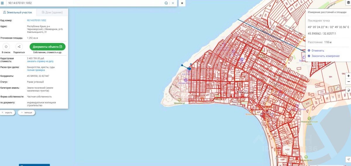 При звонке сообщите нам, пожалуйста, номер 545329 Продаётся земельный участок- 12,9 сот., ИЖС, участок угловой размерами 41*23 метра. Море в 100 метрах. Первая линия!