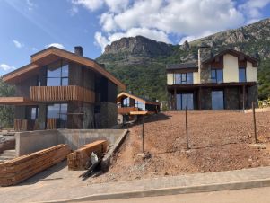 LUСНI выполнен в стиле альпийских шале с элементами современной природной архитектуры. Натуральный камень, дерево, панорамное остекление, тёплые оттенки — дома органично вписаны в горный ландшафт и продолжают его линии.