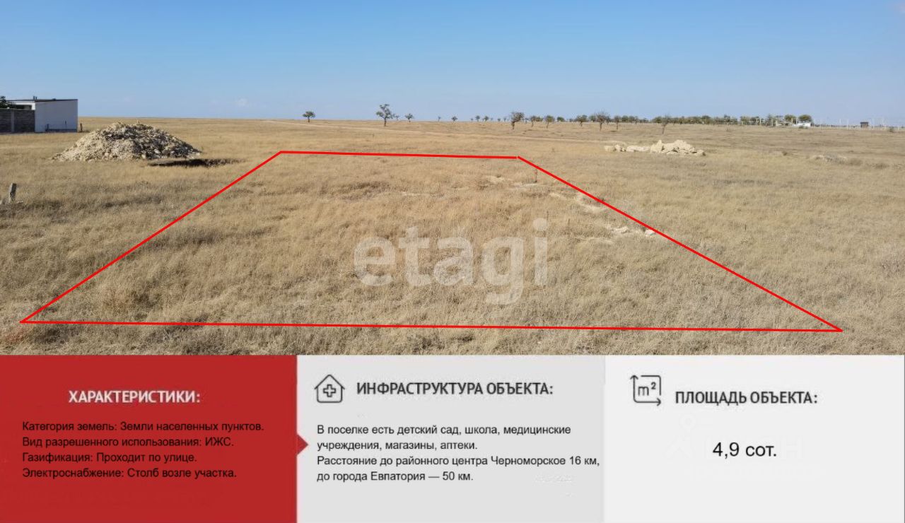 Участок отличается ровным рельефом и правильной прямоугольной конфигурацией, что оптимально для проектирования и размещения жилого дома любой архитектуры. К границе территории подведены магистральные коммуникации: центральный газ, электричество и водоснабжение. Преимуществом является расположение в километре от Черного моря и непосредственная близость к соленым озерам Ярылгач и Джарылгач, известным своими лечебными грязями. С участка открывается панорамный вид. Подъезд осуществляется по асфальтированной дороге, что обеспечивает легкую доступность в любое время года.