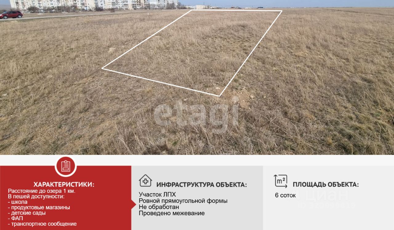Участок расположенный в километре от побережья озера Донузлав. В границе села есть вся необходимая инфраструктура, такая как: детские сады, школа, детские развлекательные центры. Магазины, аптеки, ФАП, парки и рынок находится в пешей доступности. Транспортное сообщение круглогодичное.