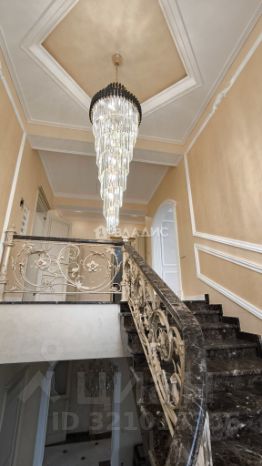 - Лестница с кованными перилами, над ней каскадная дизайнерская люстра.