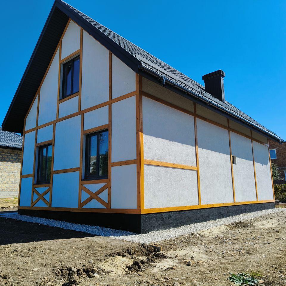 Отличная современная планировка дома: прихожая 11м2, 2 спальни 13м2 и 15м2, санузел 6м2, большая кухня-гостинная 25м2 с панорамным остеклением и выходом на террасу, 2 этаж свободная планировка 70м2.