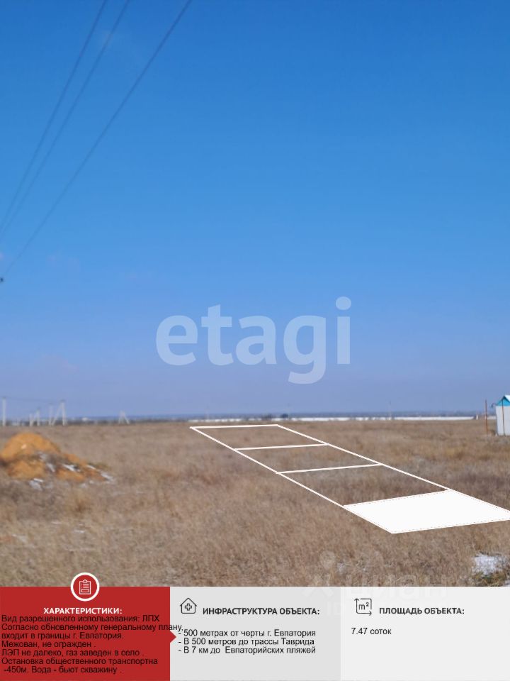 Электричество находится всего в 250 метрах, а также есть возможность подведения газа. Вода - бьют скважину . Земельные участки, согласно обновленному генеральному плану, входит в границы г. Евпатория, по этому возможен перевод в ИЖС.