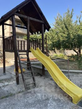 На участке есть места для парковки автомобилей, навес над въездной группой, плодовые деревья, место для огородноготворчества, оборудована детская площадка с чудесными деревянным домиком, горкой, качелями.