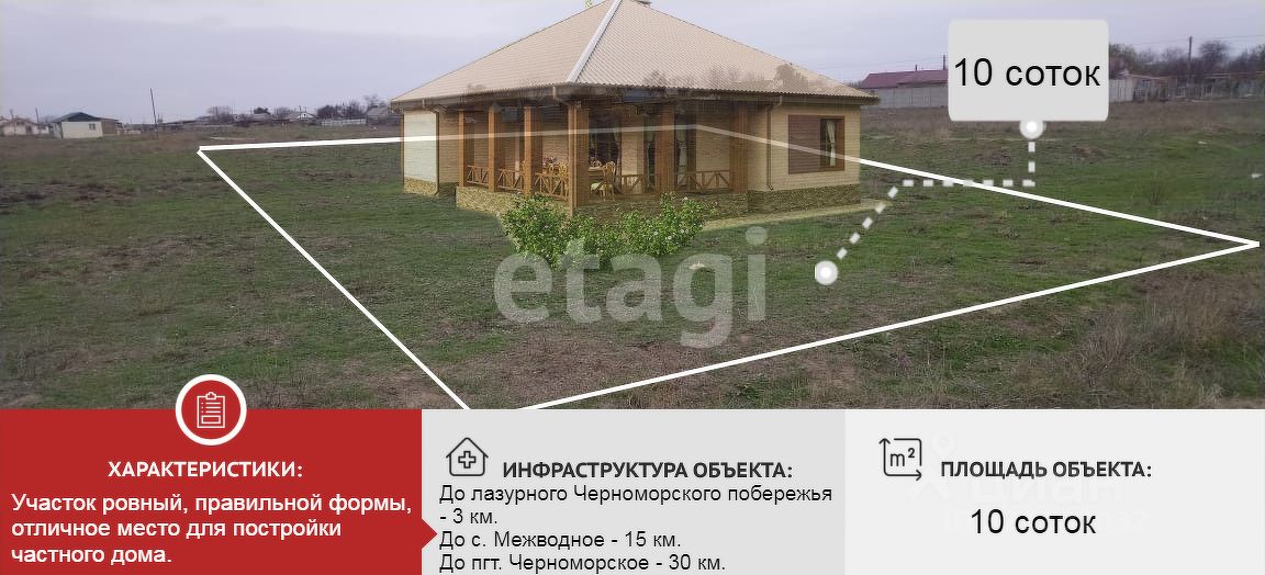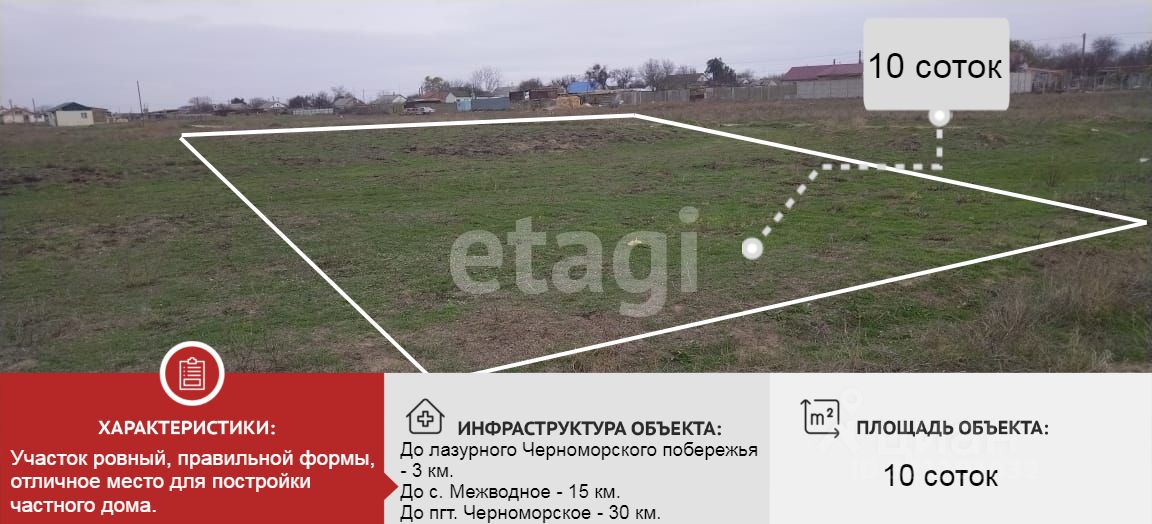 Продается отличный участок правильной формы, площадью 10 соток, в с. Владимировка, Черноморского района.