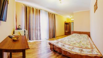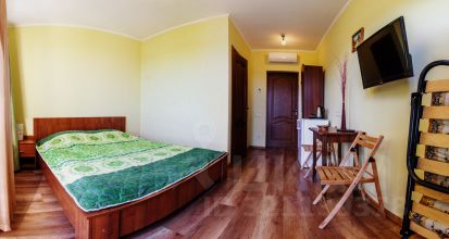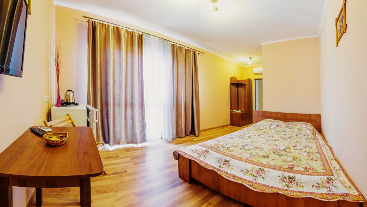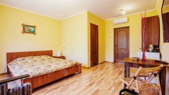 На первом этаже расположена студия: спальная комната с большой кроватью и дополнительной евро-раскладушкой, кухня и санузел. 2 этаж: кухня-гостевая, зал, две спальни и большой санузел. 3 этаж : шесть гостевых номеров с балконами и видом на море и горы. Номера оборудованы всем необходимым: тв, wi-fi, сейф, шкаф, кондиционер, санузел.