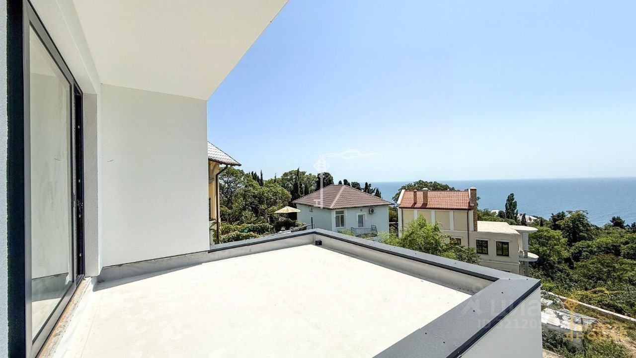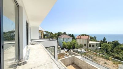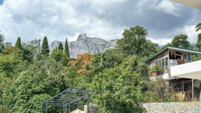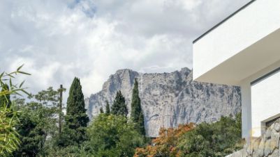 Дом выполнен в стиле хай-тек, с панорамным остеклением и просторными террасами. Из каждой комнаты открываются захватывающие виды на Черное море и гору Ай-Петри.