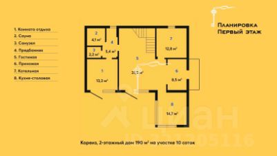 На первом этаже : прихожая, сауна, санузел, котельная, комната отдыха или спальня, кухня-столовая, просторная гостиная с выходом на террасу 40 м² и к бассейну.