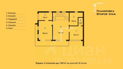На втором этаже: две спальни с выходом на балкон, два санузла, гардеробная, холл.