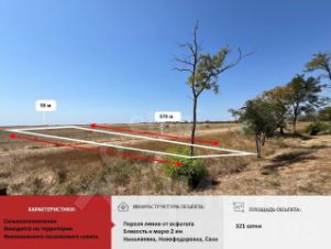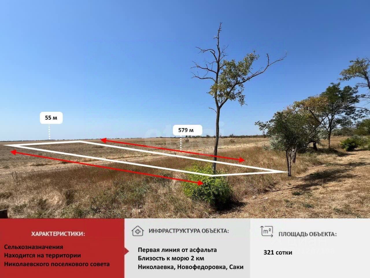 На данный момент участок обрабатывается зерновыми культурами. Близость к морю 2 км пгт Николаевка, чуть дальше пгт Новофедоровка и город Саки.