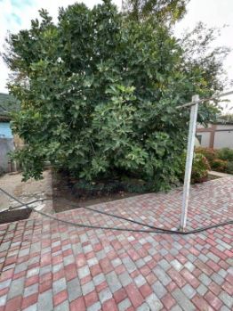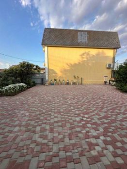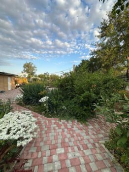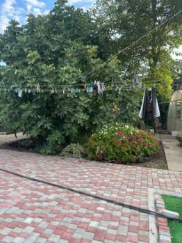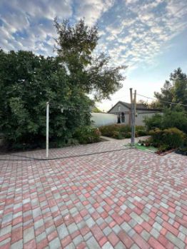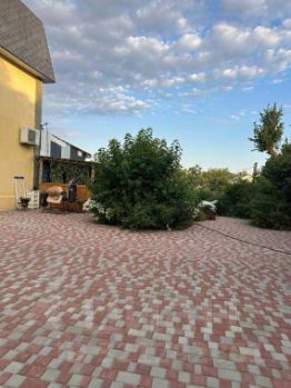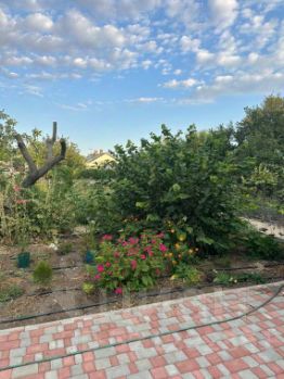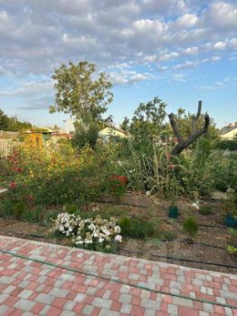 Двор полностью выложен тротуарной плиткой, прекрасные клумбы, теплица (с ремонтантной клубникой).
