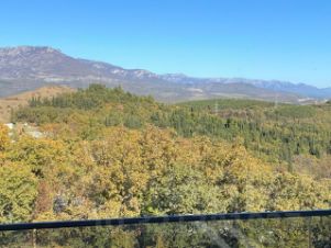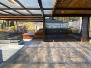 Огромные окна обеспечивают естественное освещение и открывают вид на окружающую природу. Панорамный вид на горы.