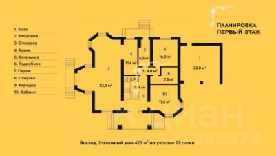 На первом этаже расположился кабинет, спальня, кухня-гостиная, санузел, просторная прихожая и технические помещения, также отдельный блок персонала состоящий из студии с кухней с отдельным входом.