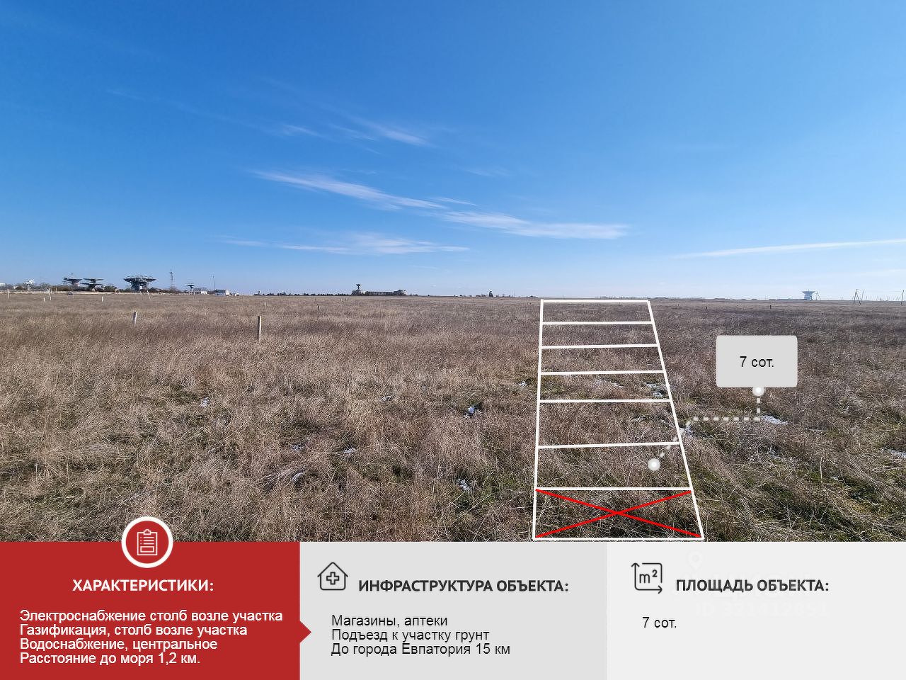 Продается уникальный участок 7 соток, ведение дачного хозяйства, в Молочненское сельское поселение, Сакский район, Республика Крым рядом с Евпаторией, ровный, недалеко от моря.