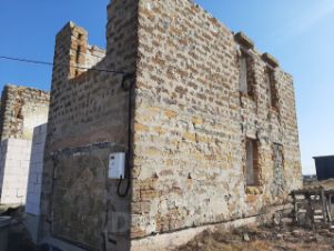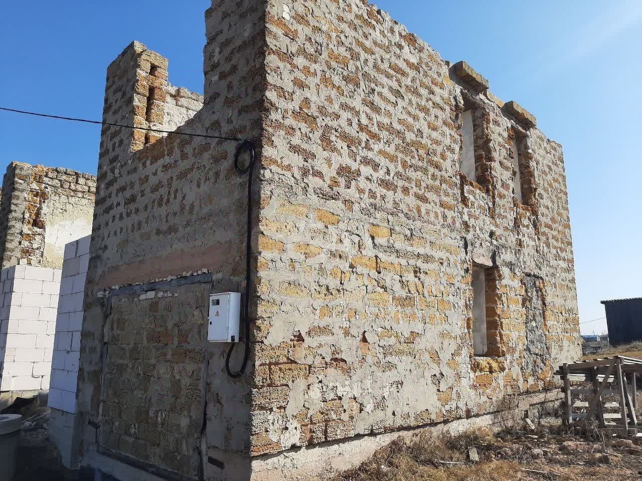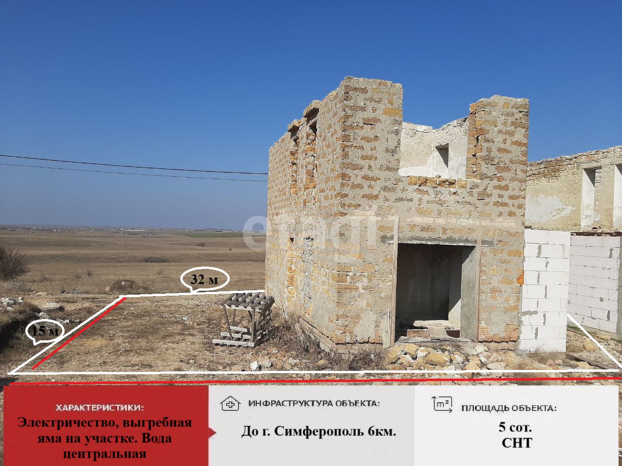 На участке имеется недостроенный двухэтажный дом, электричество, центральный водопровод, сливная яма.