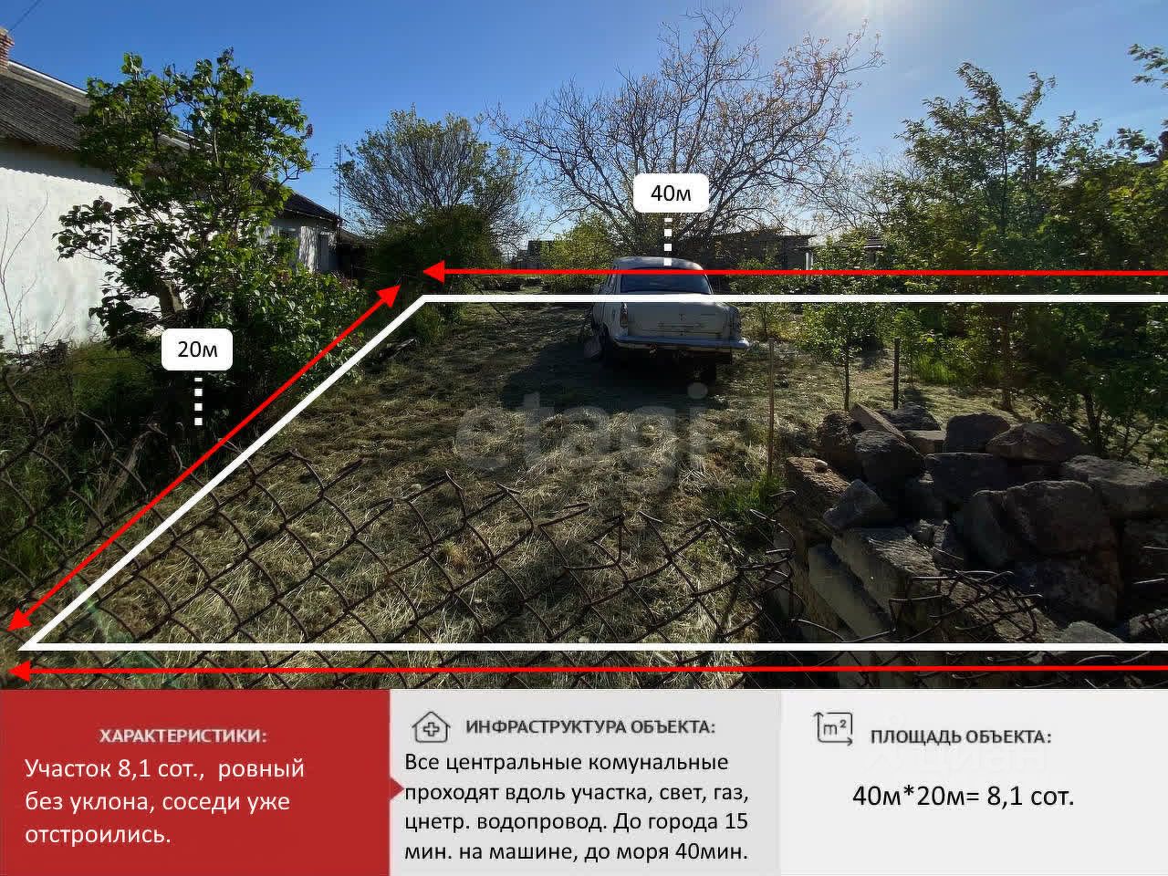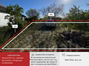 Площадь  8 соток. Категория земель  земли населённых пунктов. Вид разрешенного использования  индивидуальное жилищное строительство. Ровный участок, прямоугольной формы. Проведено межевание.