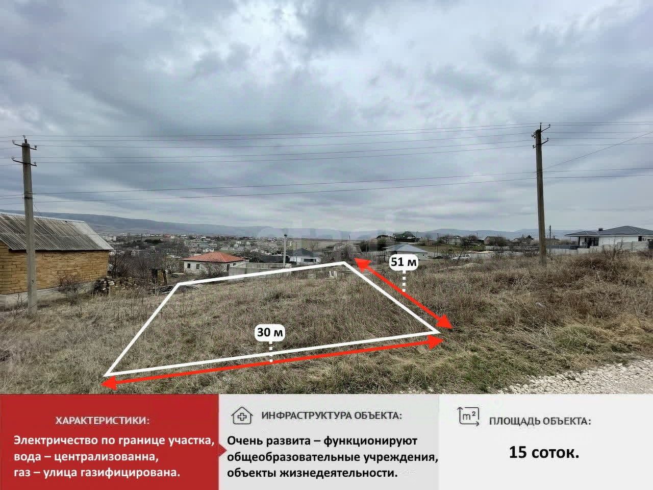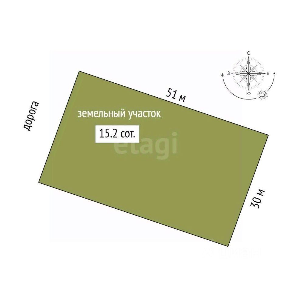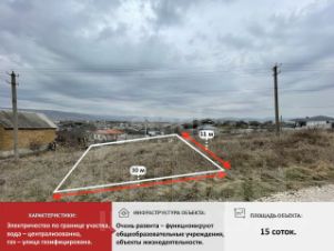 Участок прямоугольный формы, площадь составляет 15 сот., по фасаду 30 метров, сухой, не угловой, свободен от построек и насаждений, с легким уклоном.