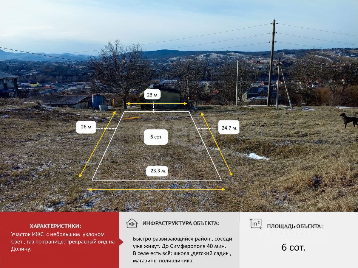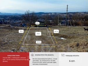 Площадь участка составляет 6 соток и идеально подходит для индивидуального жилищного строительства. Всего в 900 метрах от трассы Симферополь — Ялта, вы получаете возможность наслаждаться уединением и природой, оставаясь при этом в шаговой доступности от городской инфраструктуры.