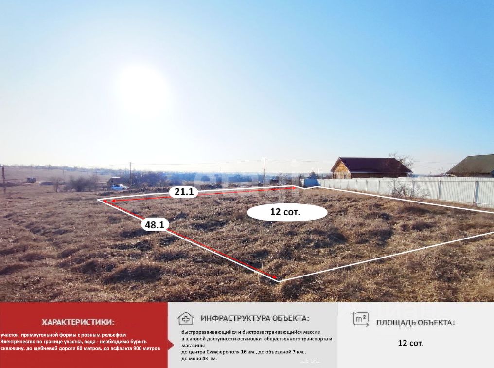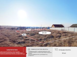 Площадь участка 12 соток, фасадная часть составляет 21.1 метра, Ровный рельеф и прямоугольная форма позволяет реализовать любые архитектурные задумки.
