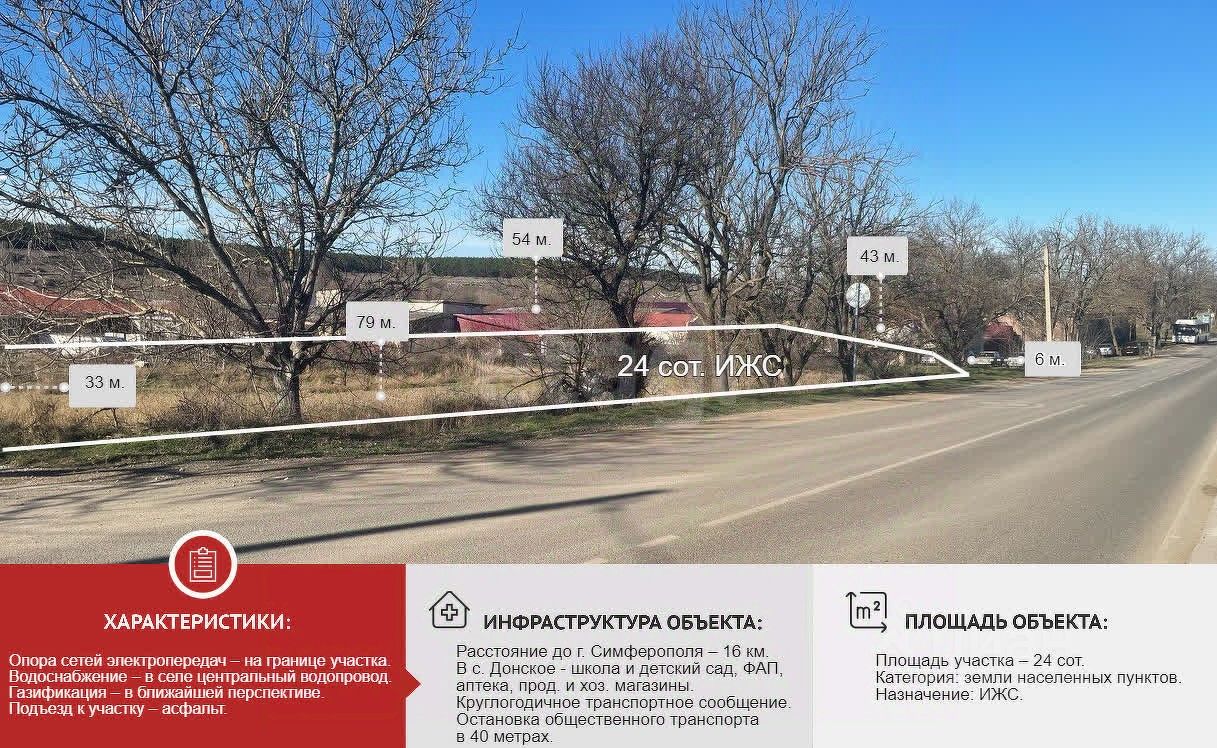 Коммуникации: сети электропередач по границе участка, водоснабжение в селе - централизованное, газификация района в ближайшей перспективе (2025-2026 год).