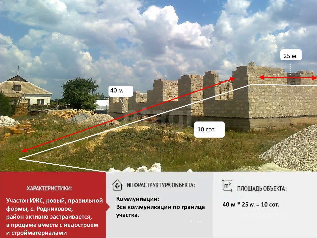 Рельеф ровный, форма правильная, на данный момент ведется строительство жилого дома, фундамент дома расположен на границе двух участков от одного собственника, что дает возможность приобрести как половину дома на участке 10 соток, так и целый дом с участком в целых 20 соток. Вопрос с межеванием решаем, собственник на данный момент в процессе решения данного вопроса.