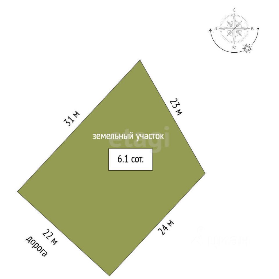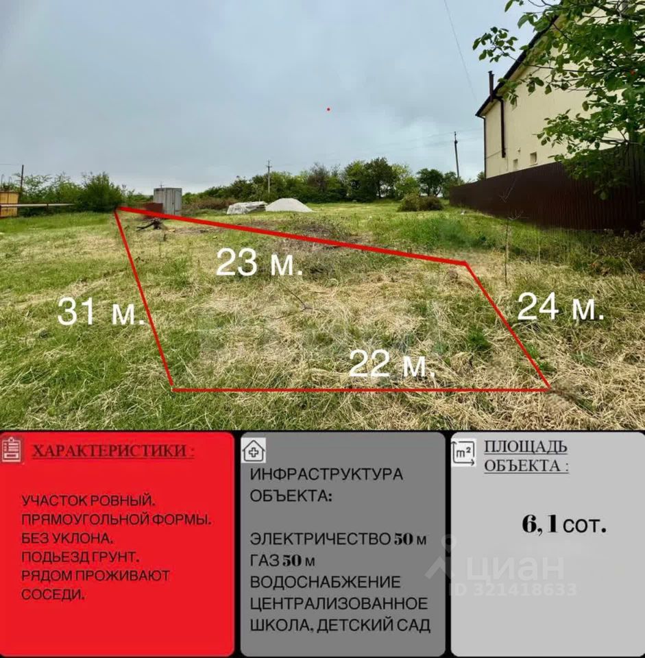 Участок прямоугольной формы, площадью 6.1 соток идеально подходит для строительства вашего дома. Газопровод, электричество и центральный водопровод уже проложены по границе участка.