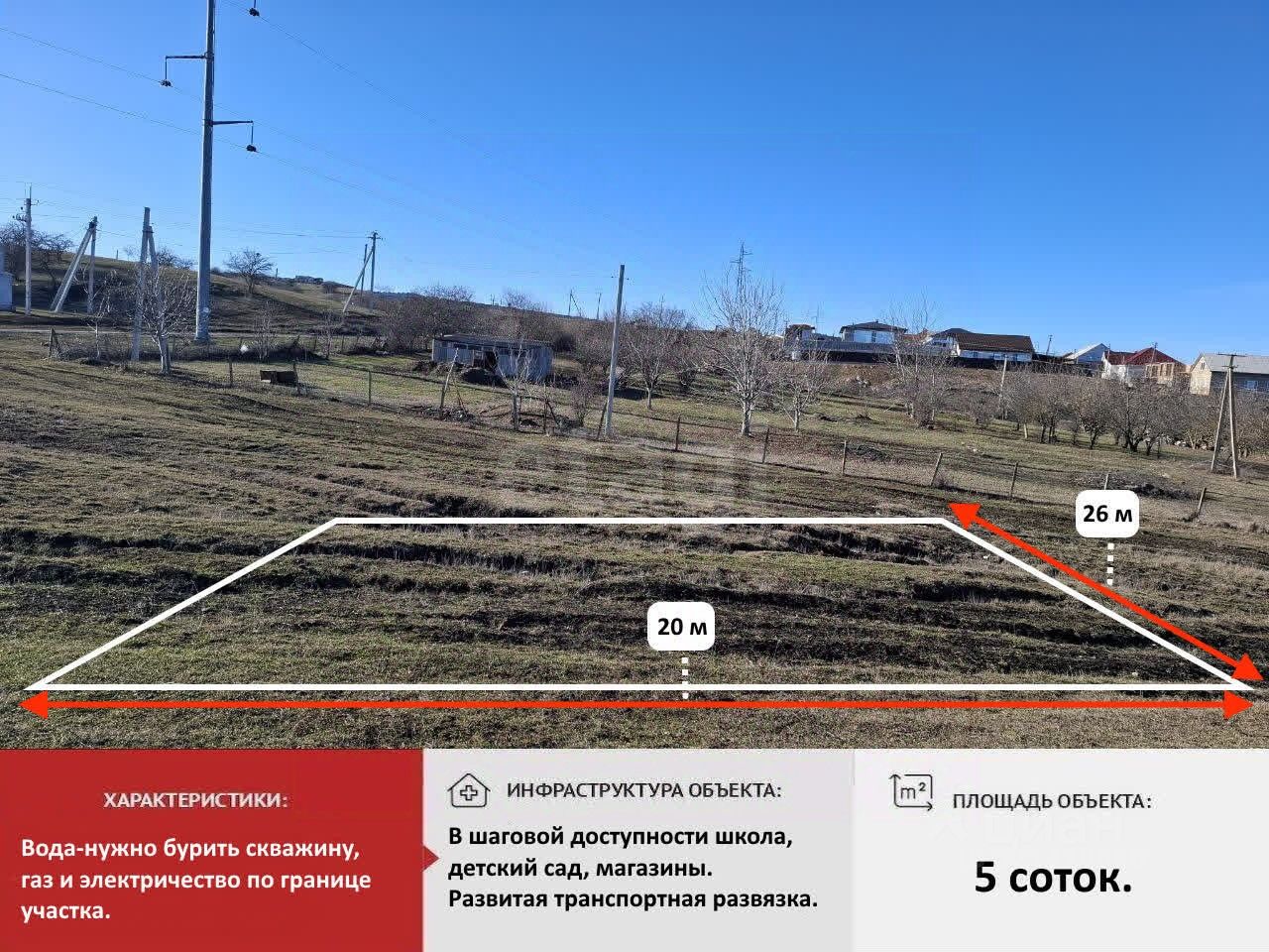 Коммуникации: вода-нужно бурить скважину, электричество и газ по границе.