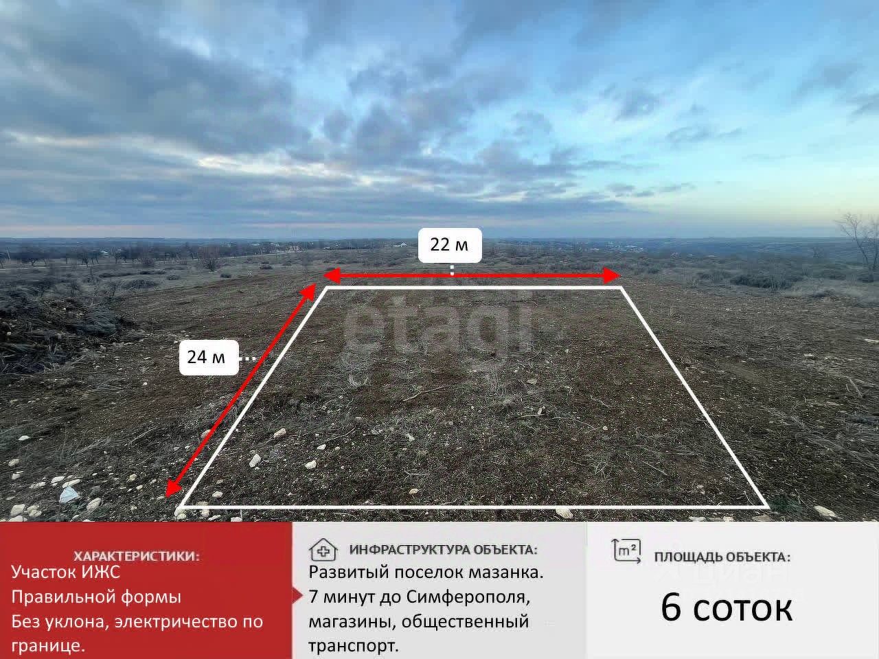 Площадь: 6 соток, правильной формы, ровный, без уклона.