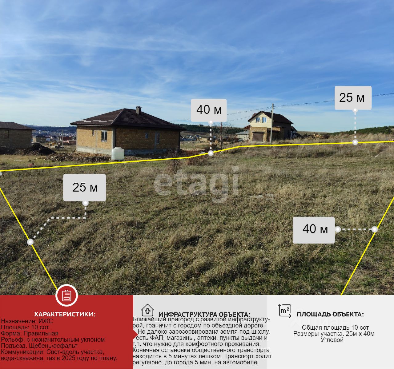 Участок расположен в активно развивающемся районе, что делает его отличным вложением для будущего. Свет уже подведен к участку, а для водоснабжения предусмотрена скважина. Газ планируется провести в 2025 году, что добавляет дополнительную ценность вашему будущему дому.