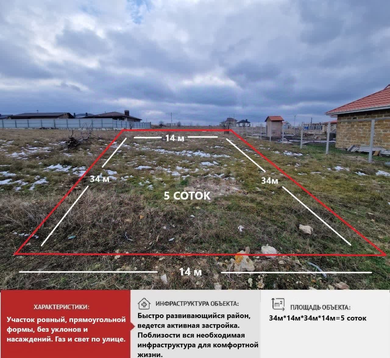 Участок ,ИЖС,5 соток ,расположен в селе Мирное, правильной формы, ровный, что обеспечивает возможность удобного и комфортного строительства.